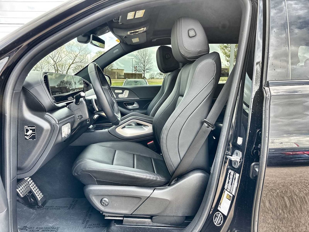 Spacious seven-passenger configuration with power-folding third-row seating. Heated and ventilated front seats with memory settings, four-way lumbar support, and passenger seat weight sensing. Dual 12.3-inch digital displays including a fully digital instrument cluster and center touchscreen. MBUX multimedia system with Apple CarPlay, Android Auto, wireless charging, NFC pairing, fingerprint sensor, sound personalization, and multiple USB ports throughout the cabin. Five-zone automatic climate control ensures comfort for every passenger.